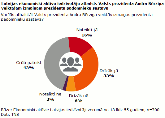 Puse (49%) Latvijas ekonomiski aktīvo iedzīvotāju vecumā no 18 līdz 55 gadiem atbalsta Valsts prezidenta Andra Bērziņa veiktās izmaiņas prezidenta padomnieku sastāvā (16% - noteikti jā; 33% - drīzāk jā).
