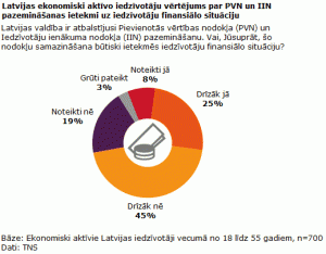 Latvijas valdība ir atbalstījusi Pievienotās vērtības nodokļa (PVN) un Iedzīvotāju ienākuma nodokļa (IIN) pazemināšanu. Trešā daļa (33%) Latvijas ekonomiski aktīvo iedzīvotāju vecumā no 18 līdz 55 gadiem pauda viedokli, ka šo nodokļu samazināšana būtiski ietekmēs iedzīvotāju finansiālo situāciju (8% - noteikti jā; 25% drīzāk jā). To atklāj pētījumu aģentūras TNS sadarbībā ar telekompāniju LNT, raidījumu 900 sekundes, maijā veiktais pētījums.
