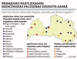 Neatliekamās medicīniskās palīdzības (NMP) dienesta reformas rezultātā četrās apdzīvotās vietās – Alsungā, Rundēnos Ludzas novadā, Ezerē Saldus novadā un Ugālē Ventspils novadā diennakts ātrās palīdzības brigādes pārveidotas par dienas brigādēm. Nakts laikā uz izsaukumiem pie pacientiem dodas brigādes no tuvīnās apkārtnes, un, kā uzsver NMP dienesta vadība, brigāžu darba režīma pārorganizēšana nav pasliktinājusi operatīvo situāciju, un to dienests varot pierādīt ar datiem.