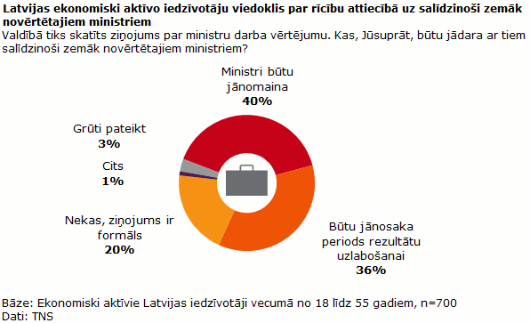 Aptuveni trešā daļa (36%) Latvijas ekonomiski aktīvo iedzīvotāju norāda, ka tiem ministriem, kuri šajā ziņojumā būtu novērtēti zemāk, būtu jānosaka periods rezultātu uzlabošanai. Salīdzinoši biežāk uz šāda risinājuma nepieciešamību norāda gados jauni cilvēki (no 18 līdz 29 gadiem), Latvijas pilsoņi un lauku teritoriju iedzīvotāji.