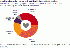 Savukārt 28% Latvijas ekonomiski aktīvo iedzīvotāju vecumā no 18 līdz 55 gadiem neplāno 13.maijā atzīmēt Mātes dienu (8% - noteikti jā; 20% - noteikti nē).