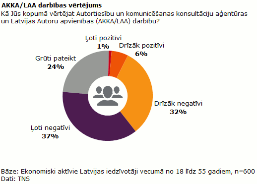 Divas trešdaļas (69%) Latvijas ekonomiski aktīvo iedzīvotāju vecumā no 18 līdz 55 gadiem Autortiesību un komunicēšanas konsultāciju aģentūras un Latvijas Autoru apvienības (AKKA/LAA) darbību vērtē negatīvi (37% - ļoti negatīvi; 32% - drīzāk negatīvi).