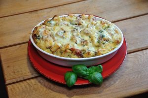 Kartupeļu - sēņu sacepums kārtīgai pusdienu maltīte laikā, kad sēnes mežā viegli pieejamas un kartupeļi jau kārtīgi paaugušies.