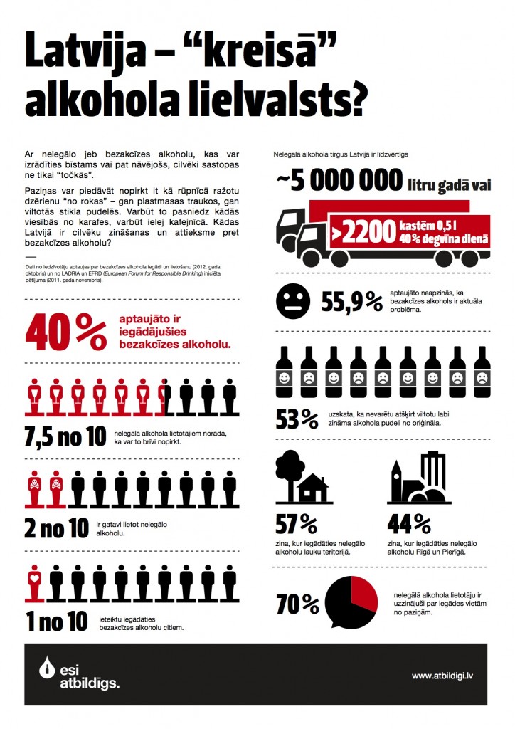 Lai vērstu iedzīvotāju uzmanību uz sekām, ko var radīt dzīvībai nelegālas un nepārbaudītas izcelsmes alkoholisko dzērienu lietošana, oktobrī tika uzsākta sociālā kampaņa “Aizkulises”. Kampaņas ietvaros tika veikts pētījums, kas atklāja vairākus faktus par alkohola lietošanas paradumiem Latvijā**. Piemēram, 55,9% Latvijas iedzīvotāju nelegālo alkoholu par problēmu neuzskata. Savukārt 53% atzinuši, ka viņi nespēj atšķirt viltotu alkoholu no oriģinālā. Pētījuma svarīgākie secinājumi ir apkopoti infografikā, kas ir redzama zemāk.