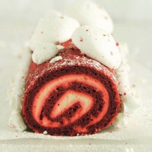 izsijātus miltus sajauc ar sāli, cepamo pulveri. Paniņas ielej traukā, tajās iejauc pārtikas krāsvielu un sakuļ viendabīgu konsistenci. Putojamā traukā liek mīkstu sviestu, pievieno cukuru un puto, līdz cukurs izkusis. Pievieno un iemaisa vaniļas ekstraktu. Pa vienai liek klāt olas, kārtīgi ieputojot sviesta masā. Iemaisa izkausētu šokolādi. Pievieno vienu trešo daļu miltu, kārtīgi izcilā. Pielej ½ sarkano paniņu, izcilā. Pievieno daļu no atlikušajiem miltiem, atkal kārtīgi izcilā. Pievieno atlikušo paniņu daļu un pēdējo miltu daļu – labi izcilā, lai veidotos viendabīga mīkla. Pannu izklāj ar cepamo papīru, ietauko un lej mīklu. To izlīdzina un liek iepriekš sakarsētā cepeškrāsnī, kur 175 grādu temperatūrā cep 35 minūtes. Lai biskvīts nelūztu un to viegli varētu satīt ruletē, dara tā: vēl karstam biskvītam uzliek virsū cepamā papīra loksni un biskvītu sarullē. Kad tas nedaudz padzisis, ruleti attin. Pēc tam to klāj ar krēma pildījumu un atkal satin. Dekorē ar pūdercukuru, bezē cepumiņiem vai jebko citu, kas tādam košam gardumam piestāv!