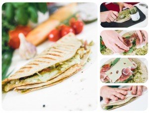 1. Pilngraudu tortiljas pārsmērē ar pesto