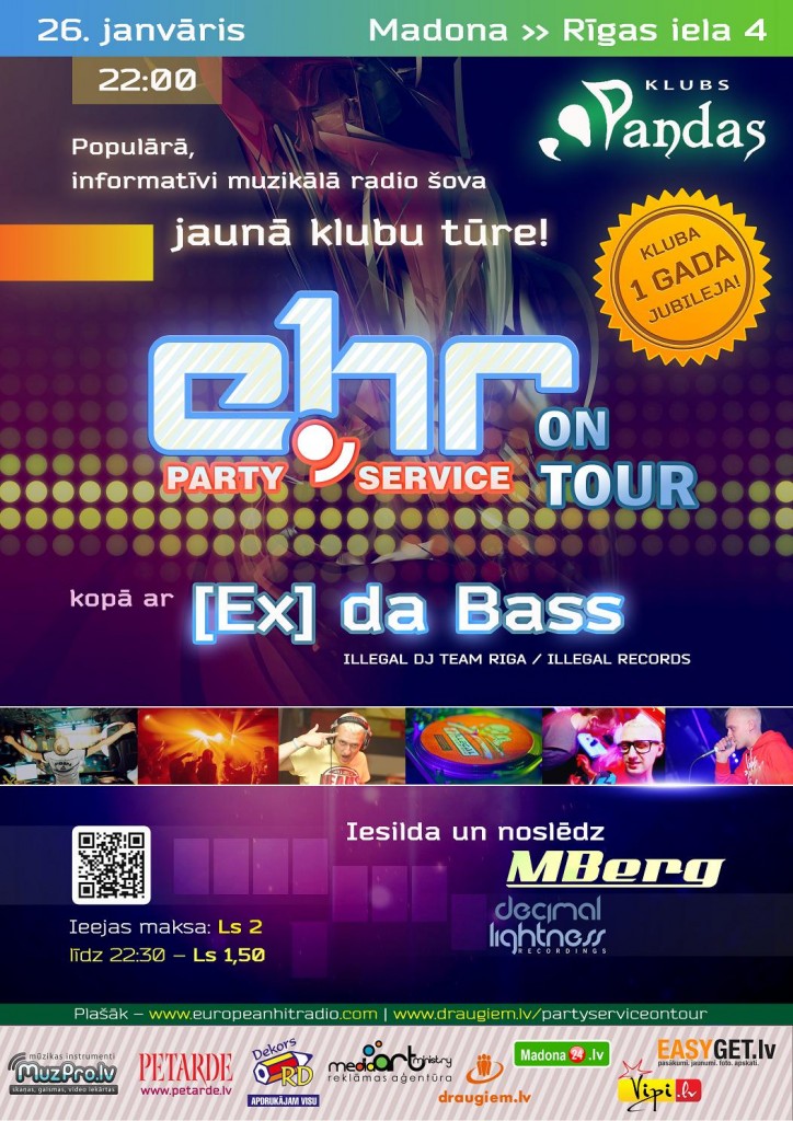 Sestdiena, 26.janvāris Madonas un tuvāko pilsētu naktsdzīves baudītājiem būs lieli svētki, jo klubs “PANDAS” (Madona, Rīgas iela 4) ar vērienu svinēs 1 gada pastāvēšanas jubileju. Kluba dzimšanas dienas dāvana apmeklētājiem – populārākā Latvijas dīdžeja [Ex] da Bass uzstāšanās un viņa informatīvi muzikālā “EHR” radio šova “Party Service” jaunās klubu tūres “PARTY SERVICE ON TOUR” pasākums.