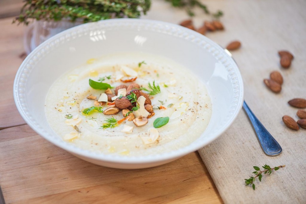 - Sasildi zupu vēlreiz, pasniedz ar grauzdētām mandelēm, svaigām timiāna lapiņām, pārlej ar sulu no ½ citrona