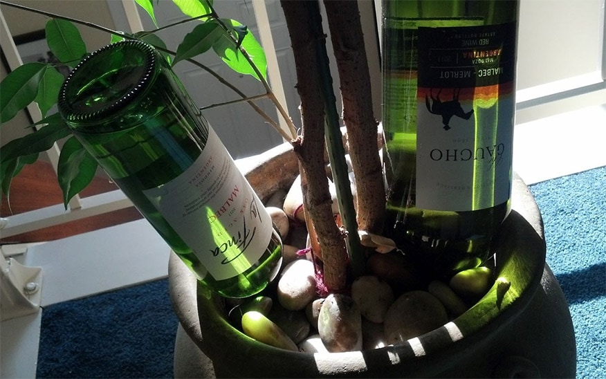 Izmanto tukšas vīna pudeles, lai pasargātu augus no izžūšanas. Piepildi pudeli ar ūdeni un ievieto puķu podā vai dobē. Tādā veidā ūdens lēnām mitrinās augsni un vairs nevajadzēs uztraukties par augu laistīšanu, esot prom no mājām ilgāku laiku.
