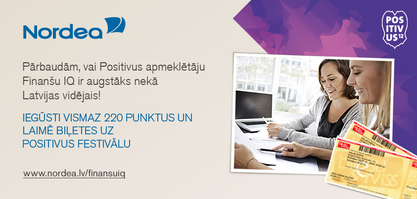 Kopīgi pārbaudīsim, vai Positivus festivāla apmeklētāju Finanšu IQ ir augstāks par Latvijas iedzīvotāju vidējo rādītāju. Nordea banka līdz 19. jūlijam aicina Positivus festivāla apmeklētājus pārbaudīt savu Finanšu IQ. Tie, kuriem rezultāts būs augstāks par 220 punktiem un, kuri ar to dalījies sociālajos portālos Twitter, Facebook vai draugiem.lv, katru darba dienu varēs laimēt divu dienu biļeti uz Positivus festivālu. Lai savu zināšanu līmeni celtu, līdz ar Finanšu IQ testu ir pieejama arī Finanšu zināšanu rokasgrāmata.