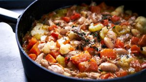 Receptes variācija: 5 l katlā kārtās kārto neceptus kabačus, burkānus, sīpolus, tomātus, rīsus, saldos piparus un netaupa baziliku, dilles, seleriju zaļumus. Kārtas atkārto 2x. Uz katlu vajadzēja ~ 700 gr maltas cūkgaļas, 4 lieli sarkanie pipari. Vārīšanās laiks nav ilgs ~ 15-20 minūtes.