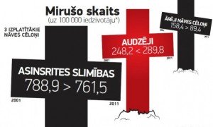 Jau desmit gadus Latvijā galvenie iedzīvotāju mirstības rādītāji ir tādi paši – 2001. gadā pirmajā vietā bija sirds asinsvadu slimības, un tās bija nāves cēlonis vairāk nekā pusē nāves gadījumu, un arī 2011….