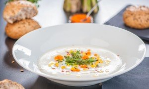Siera un topinambūru krēmzupa ar sparģeļiem