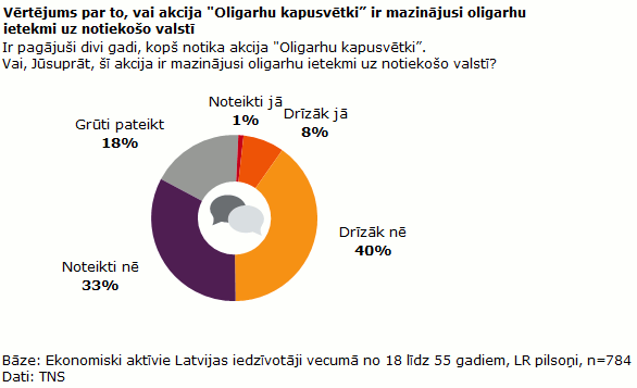 Savukārt lielākā daļa (73%) Latvijas pilsoņu vecumā no 18 līdz 55 gadiem uzskata, ka akcija „Oligarhu kapusvētki” nav mazinājusi oligarhu ietekmi uz valstī notiekošo (40% - drīzāk nē, 33% - noteikti nē). Salīdzoši biežāk šādu atbildi snieguši vīrieši, Vidzemes reģiona iedzīvotāji.
